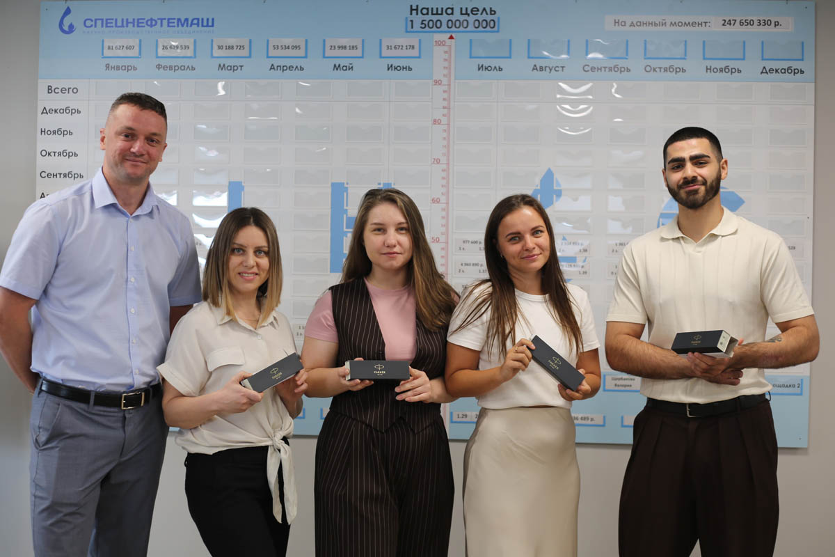 В компании ООО "НПО "Спецнефтемаш" есть уникальная традиция, в которой принимает участие каждый новый сотрудник отдела продаж. После успешного заключения первой сделки с заказчиком сотрудникам вручают ручки Parker в знак признания их достижений. Этот важный рубеж отмечается не только заключенным контрактом, но и «посвящением» в ряды настоящих мастеров продаж!