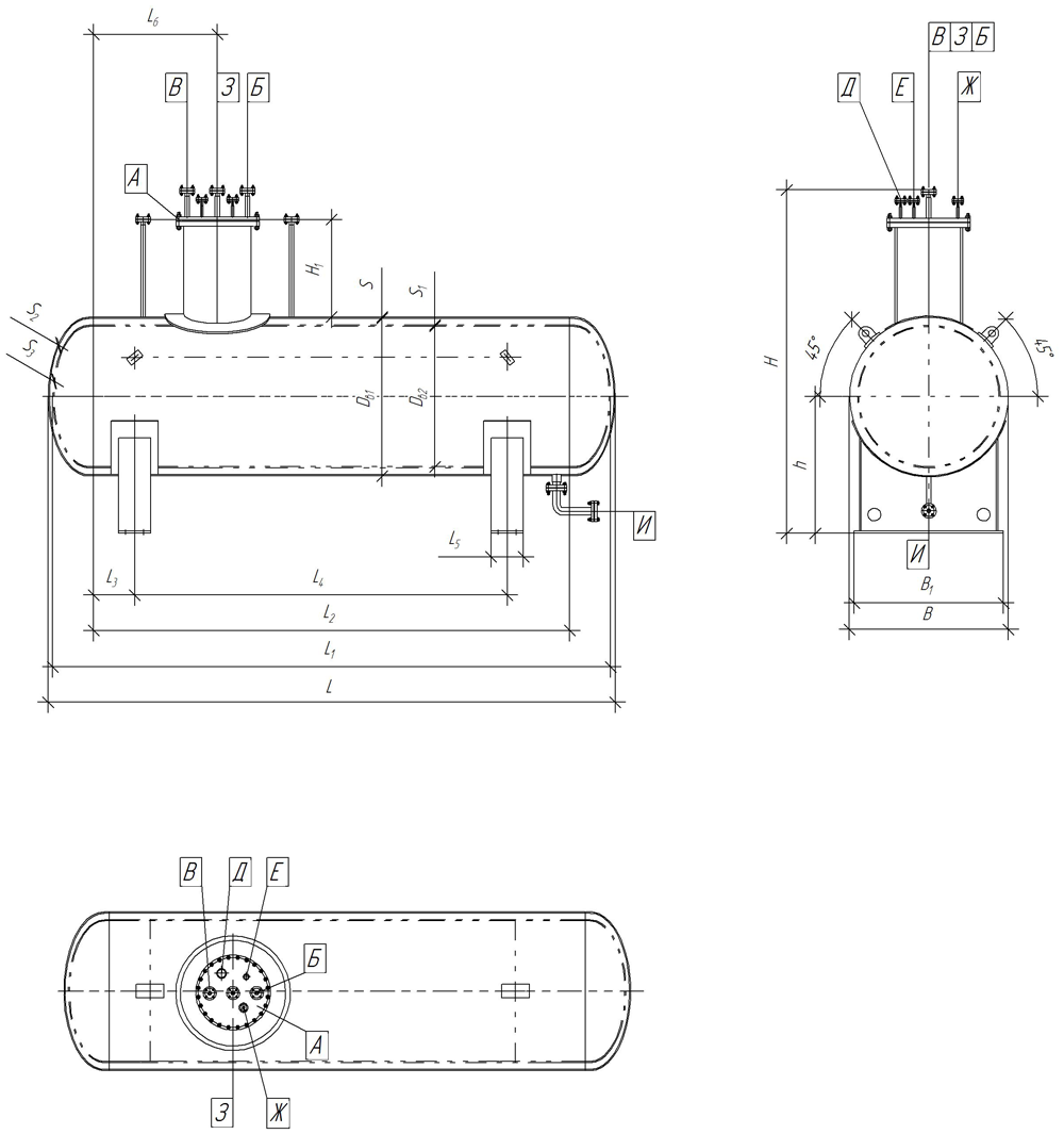 Обозначение Назначение Размеры в зависимости от объёма аппарата А Для входа продукта 32–150 Б Для выхода продукта 32–150 В Для связи по газу 32–100 Г Для датчиков уровня по запросу Д Для дренажа 50 Е Для манометра М20х1,5 Л Для поверки датчиков по запросу И Люк 600–800 К Для предохранительного клапана 50–150 -