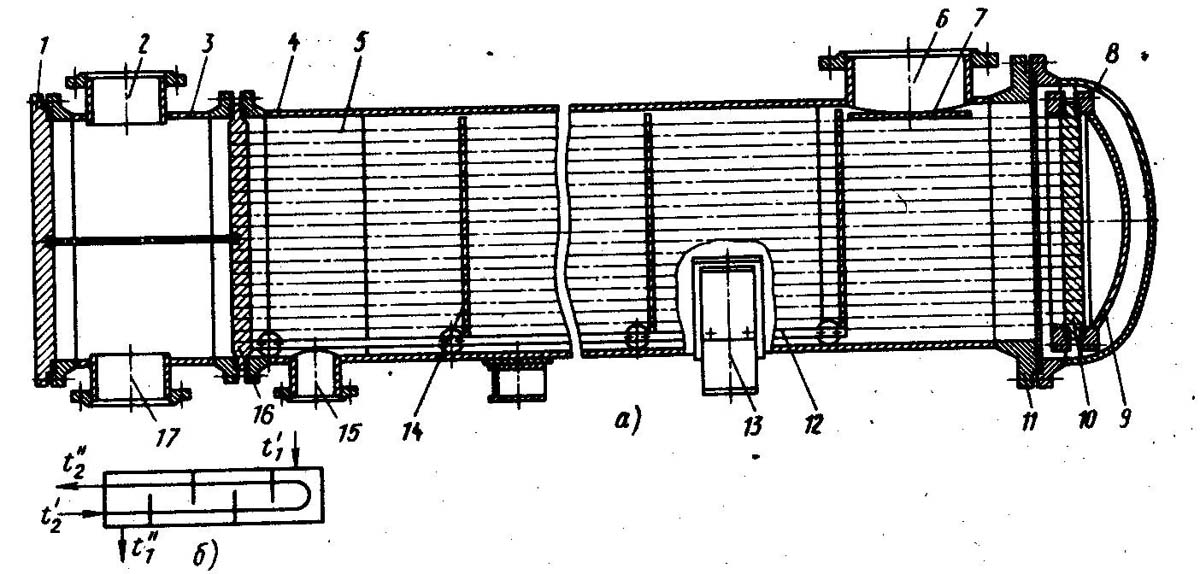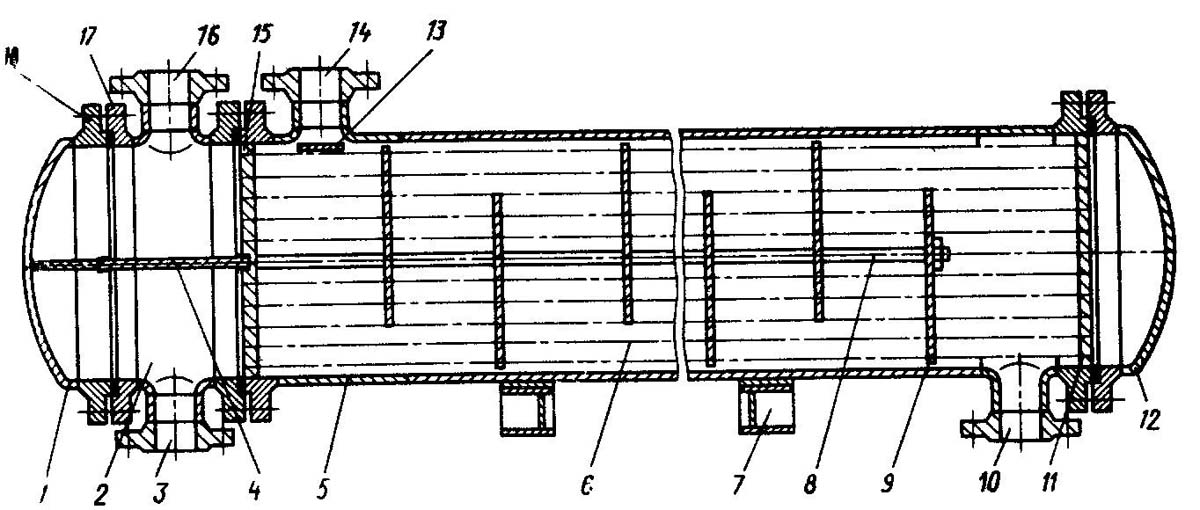 2, 17 - штуцера для ввода и вывода теплоносителя, подаваемого в трубное пространство;